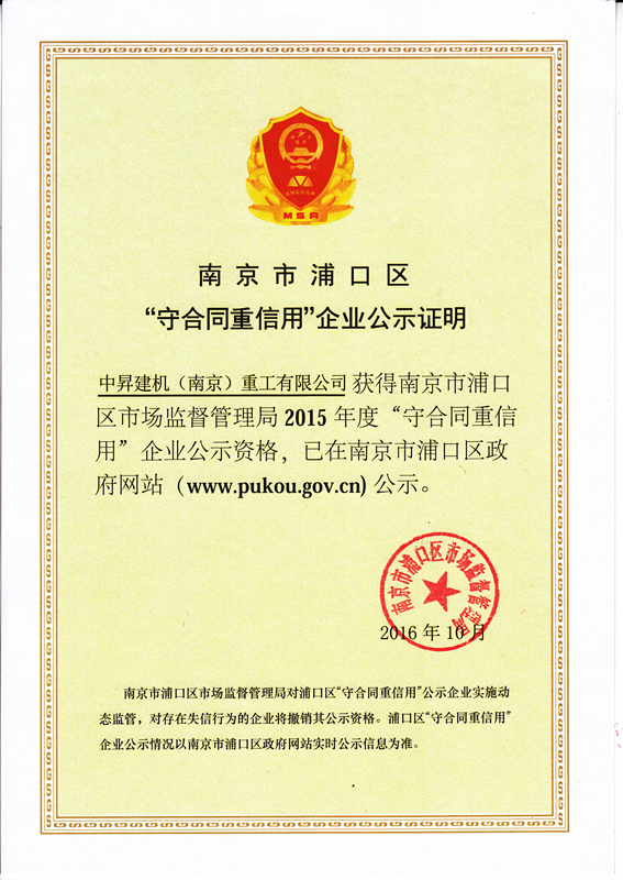 中昇建機榮獲2015年度“守合同重信用”企業(yè)公示資格