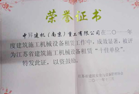 中昇建機(jī)被評為2011年度江蘇省建筑施工機(jī)械設(shè)備租賃“十佳單位”