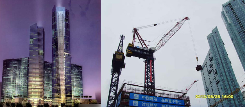 施工高度一棟200米、一棟180米,采用中昇建機(jī)ZSL850(50t)一臺(tái)、ZSL750(50t)一臺(tái)。