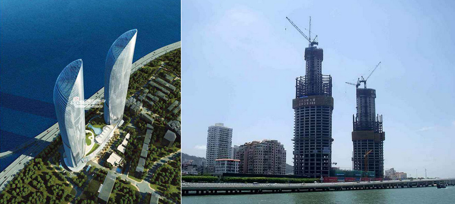 施工高度307米,采用中昇建機(jī)兩臺(tái)ZSL1250(最大吊重64t),一臺(tái)ZSL750(最大吊重50t)