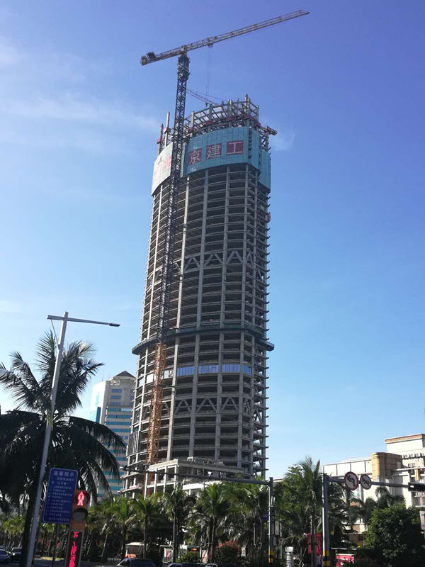建筑高度306米,采用中昇建機(jī)內(nèi)爬動(dòng)臂式塔機(jī)ZSL500(32t)