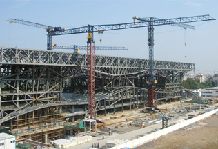 施工高度319.5米,采用中昇建機(jī)一臺(tái)ZSL1200(最大吊重60t)和三臺(tái)ZSL650(最大吊重32t)
